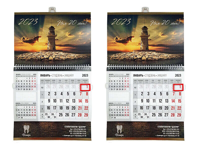 Quarterly calendar with a logo is an excellent promotional souvenir, a budget corporate gift to customers and partners, which is easy to order at the Pencil printing center. The calendar format with advertising fields allows you to place additional information on it: contacts, slogan, etc. We produce not only standard quarterly calendars, but also exclusive versions with a cap cut out in the form of your logo or business symbol.