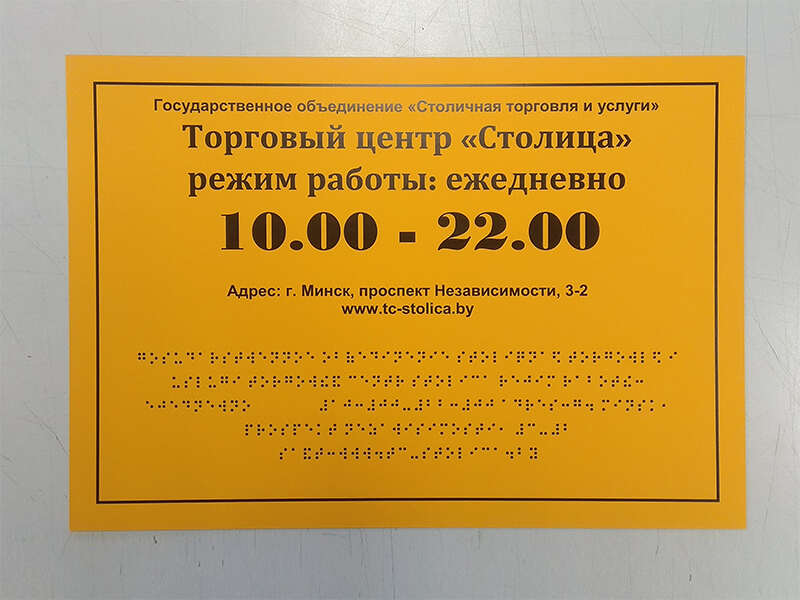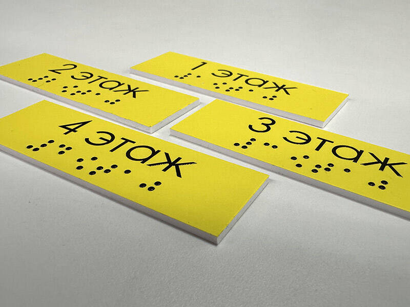 Braille printing provides an opportunity for visually impaired people to obtain information about the surrounding space (diagrams, signs, signs), read text and other documents. You can order Braille printing using UV printing on self-adhesive film, paper and other materials from us. UV printing allows you to create images that are resistant to abrasion, light, humidity, and other environmental factors. Tactile printing is performed with a height of 0.6 mm or more, which allows people with visual impairment or lack of vision to comfortably perceive information.