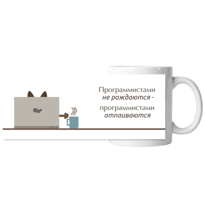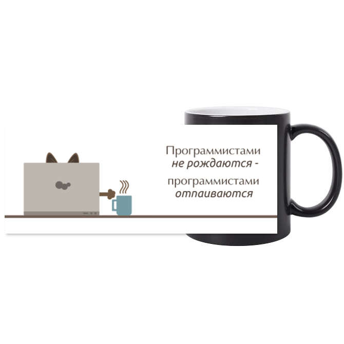 The mugs are black A programmer cat with a cup of coffee