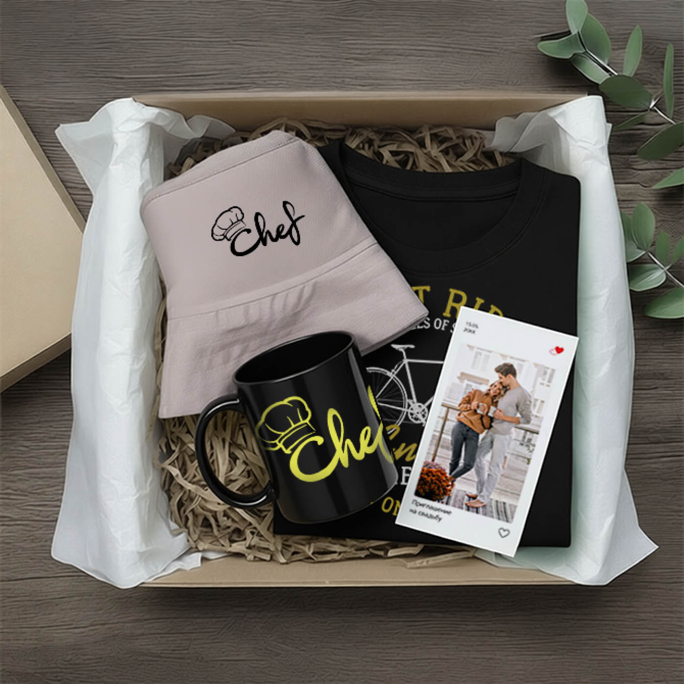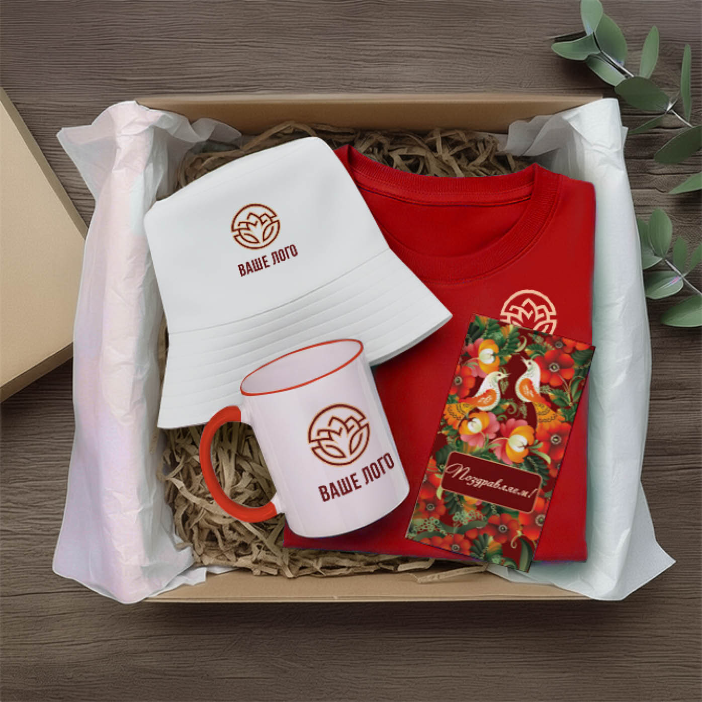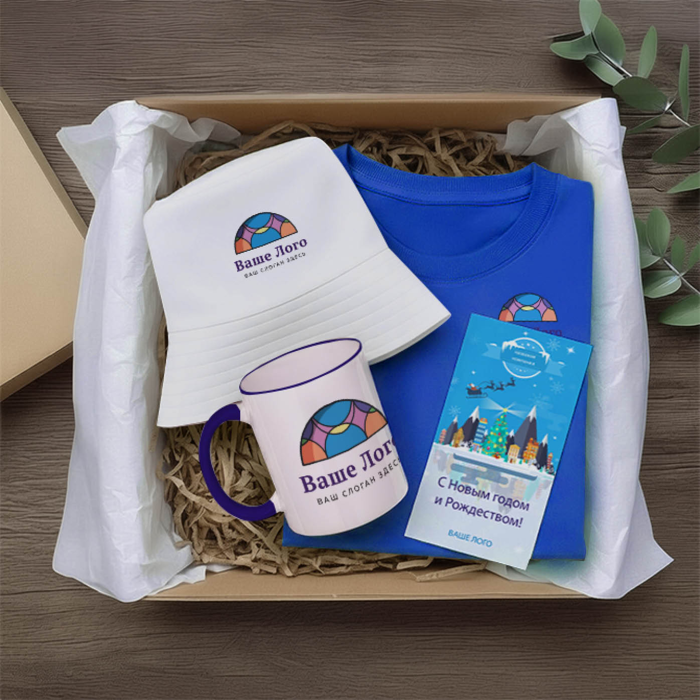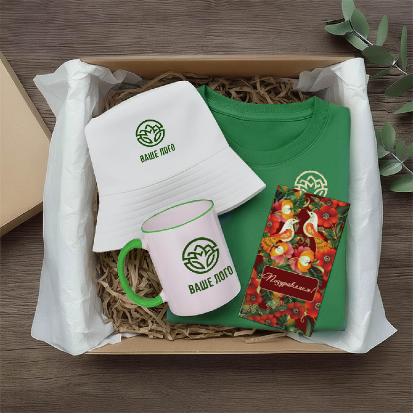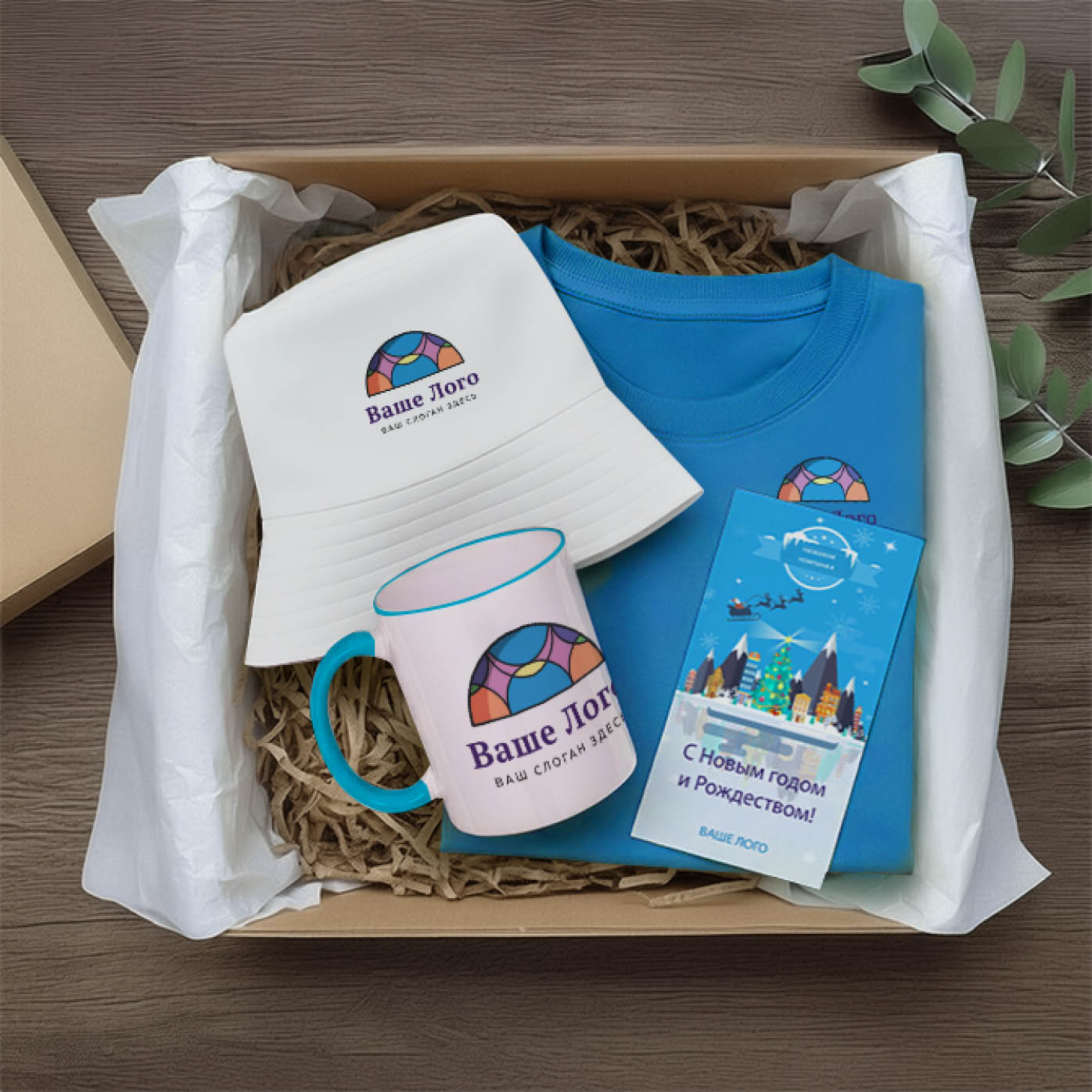 A summer corporate gift set with your logo: a panama hat, a T-shirt, a ceramic mug and a postcard. Different colors and models, in stock and on order