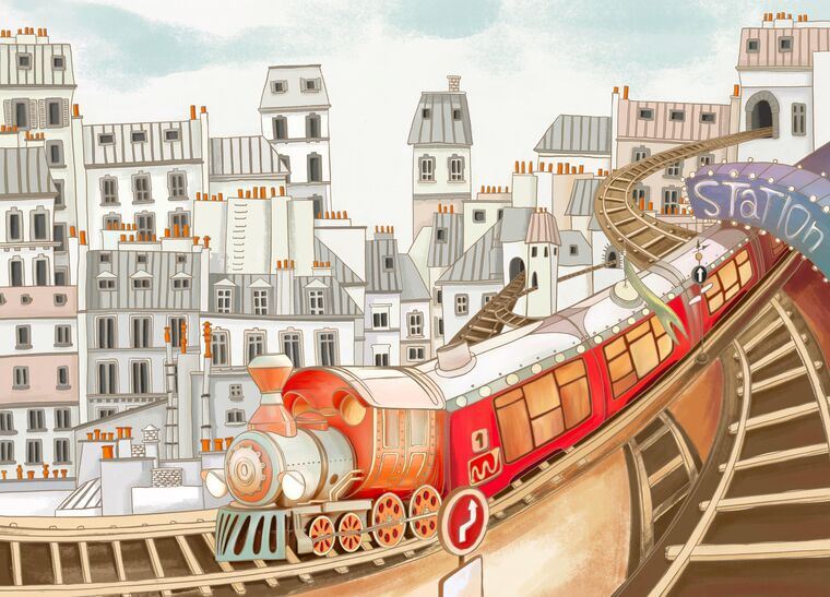 Paintings on canvas Colorful train on the background of the city