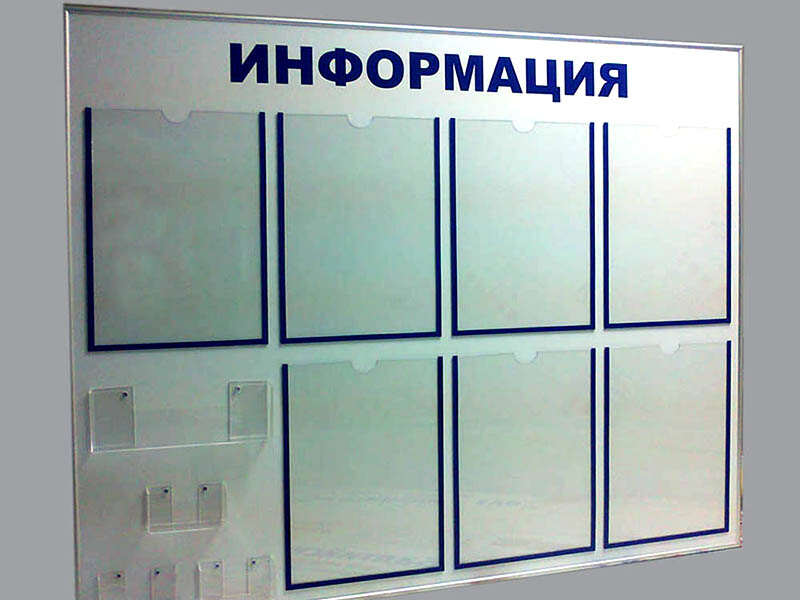 - Transparent pockets – for inserting information sheets. They have a special cutout for convenient replacement of sheets. The maximum size is 29.7 x 42 cm. The perimeter is covered with molding (gold, silver) or colored film.