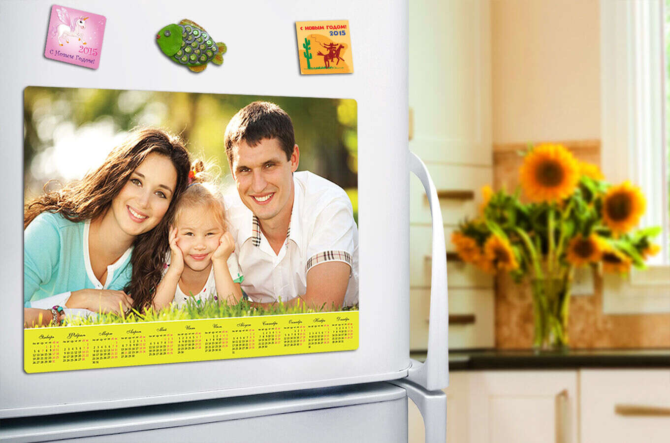 Магнитный календарь представляет собой распечатанное изображение с вашим фото, текстом и календарной сеткой на виниловой магнитной основе. Календарь-магнит размещается на холодильнике, любой металлической поверхности. Сильный магнит надежно закрепляет изделие.