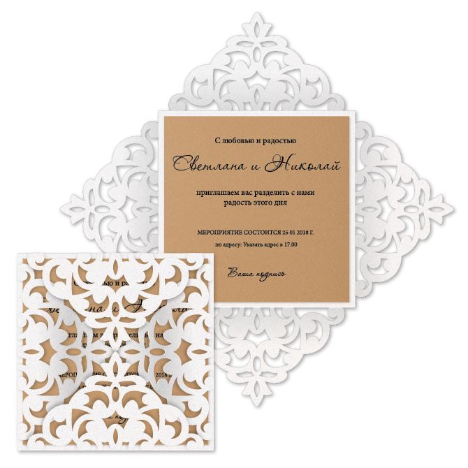 С помощью фигурной резки и тиснения бумаги можно получить по-настоящему эксклюзивнуые приглашения. Любые формы и размеры, резные элементы, узоры и виньетки, прорези для вкладышей, выдавленные линии и эмблемы, логотипы и эмблемы - фигурная резка и тиснение позволяют создать по-настоящему уникальные дизайнерские приглашения.