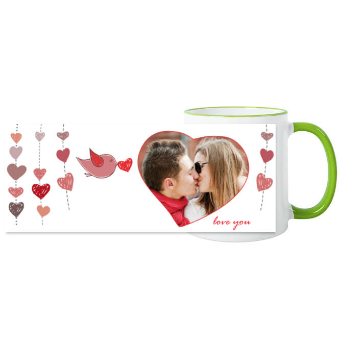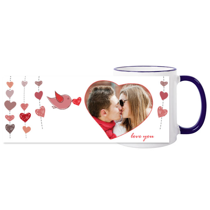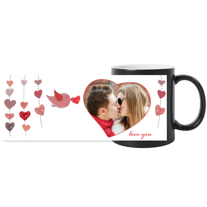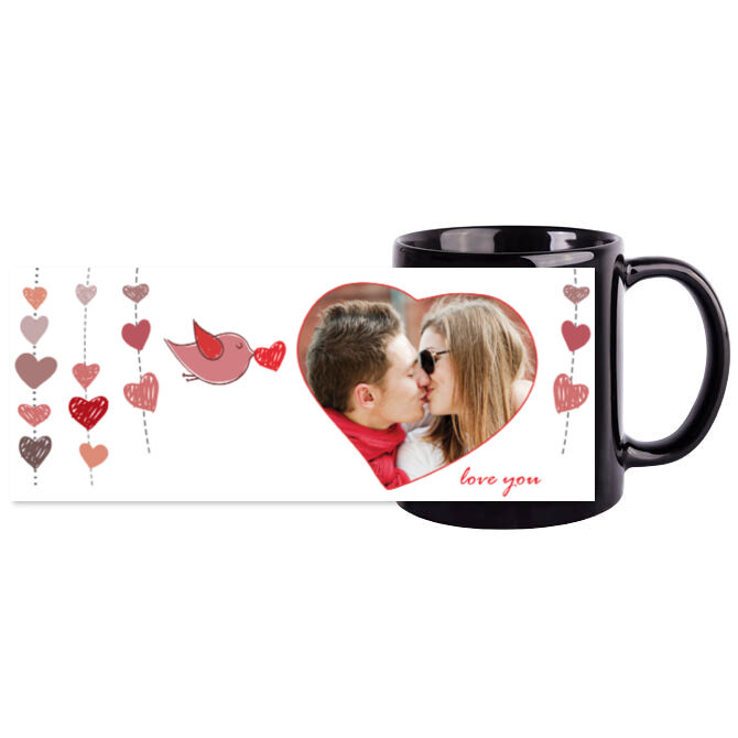 Кружки черные Гирлянда из сердечек и птичка.