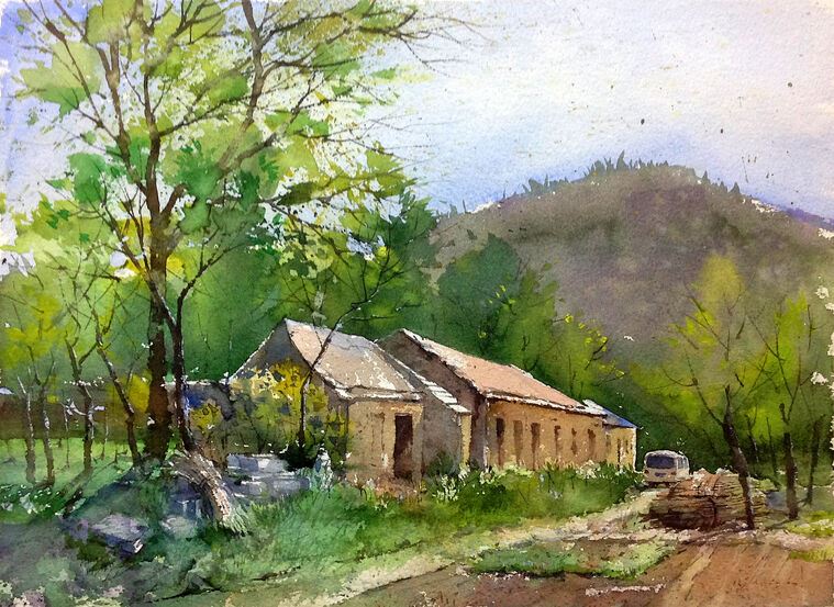Купить и печать на заказ Картины на пластике, пеноркартоне Акварельный пейзаж с домами