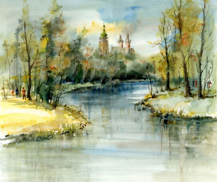Купить и печать на заказ Картины на подрамнике Замок над рекой акварель