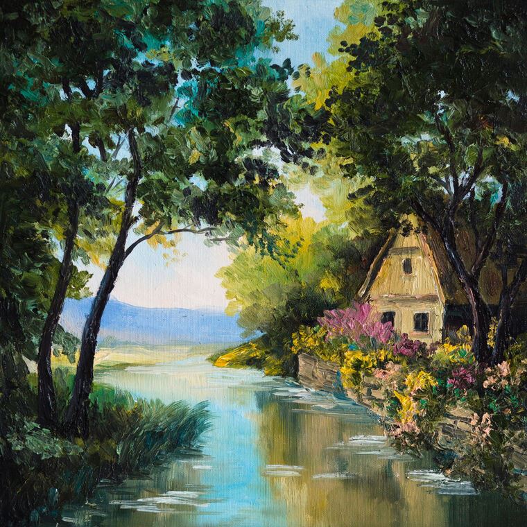 Купить и печать на заказ Картины на подрамнике Домик у реки