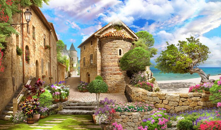 Купить и печать на заказ Картины на подрамнике Старая улица с видом на море