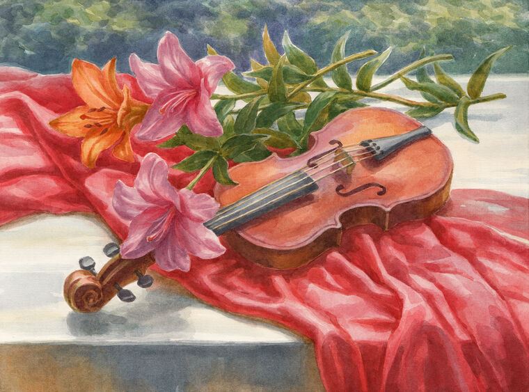 Купить и печать на заказ Картины на подрамнике Натюрморт скрипка и лилии