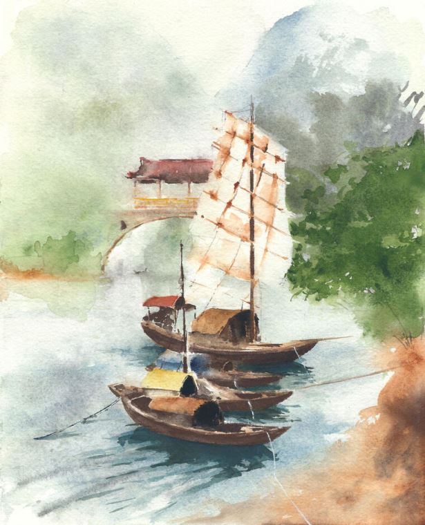 Купить и печать на заказ Картины на подрамнике Лодка на реке китайский пейзаж