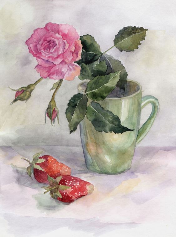 Купить и печать на заказ Картины, фото с паспарту Акварельный натюрморт с розой и клубникой