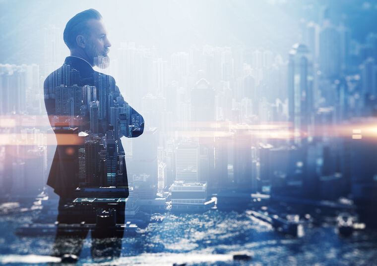 Купить и печать на заказ Картины на холсте Бизнесмен и вид на город