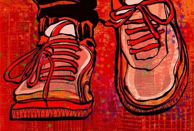 Купить и печать на заказ Картины на холсте Кроссовки на фоне города