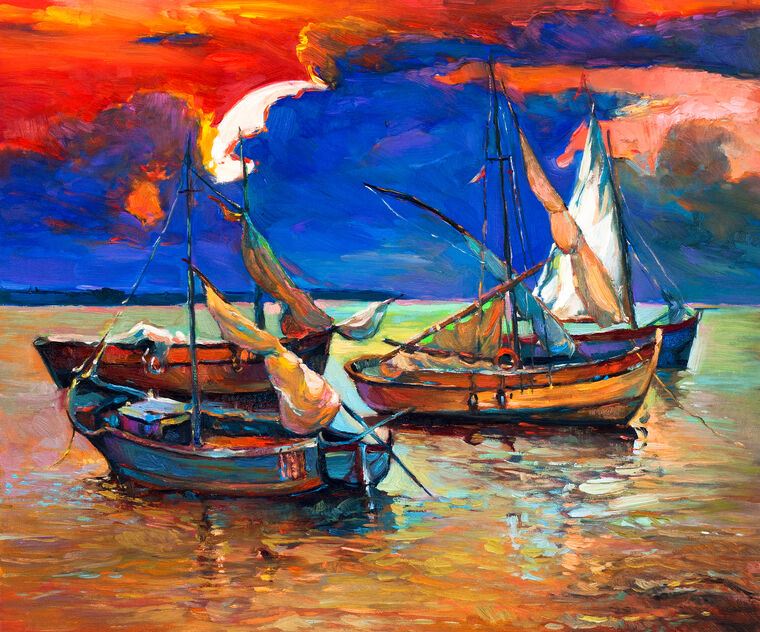 Купить и печать на заказ Репродукции картин Лодки у берега на закате